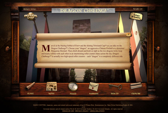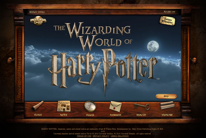 La page centrale du site d’où vous pouvez aller n’importe où s’affiche : il s’agit d’une carte de Poudlard avec divers liens proposés pointant sur les Attractions et autres activités diverses proposées tels l’envoi de Hiboux électroniques, des nouvelles sur le Parc, l’inscription à la Newsletter, ou une balade dans Pré-au-Lard par exemple !