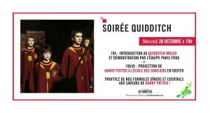 Mercredi 26 octobre, le petit cinéma parisien accueillera une soirée spéciale sur le thème du quidditch, à partir de 19h. Avant la diffusion de Harry Potter et l’école des sorciers (en vostfr), l‘équipe locale Paris Frog présentera l’histoire du sport, son matériel, ses règles, son développement, son ambiance et répondra à toutes vos questions. Vous serez tout aussi incollable sur le sport que Ron !